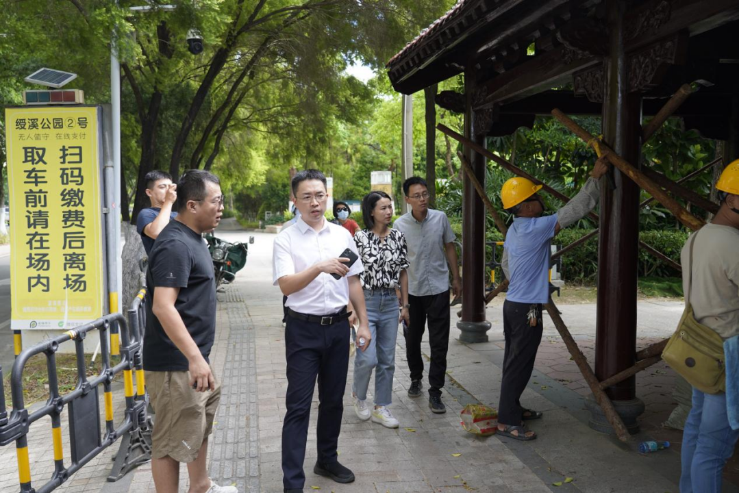 隨后前往綬溪公園、溪南路、荔園路二期、華亭苗圃基地,檢查過程中他指出按照上級要求關(guān)閉各公園、綠道、景區(qū),以減少損失為目標,全面排查易倒伏、傾斜樹木、亭廊等風(fēng)險隱患點位,提前進行支撐、加固、梳枝、清理等工作;公園綠地臨水地帶隱患點要強化檢查,密切關(guān)注水位,提前防范,整治到位。