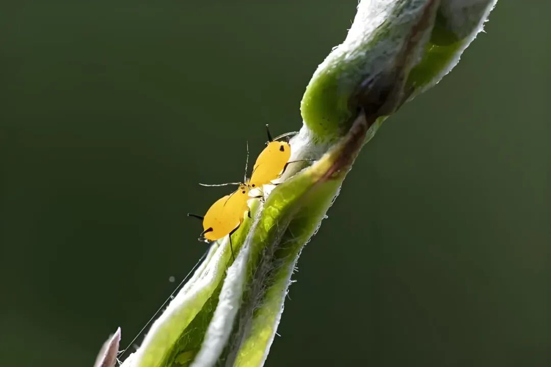 蚜蟲常聚集在幼苗、嫩葉、嫩莖和近地面的葉片上,取食寄主汁液。蚜蟲一年能繁殖20-30代,出生以后只需5天就能生育后代;壽命約3個月。蚜蟲產(chǎn)生危害時會排出大量的蜜露污染葉片和果實,從而引起煤污病的發(fā)生,影響植物光合作用,蚜蟲還能傳播病毒病,造成病毒病的大面積發(fā)生。